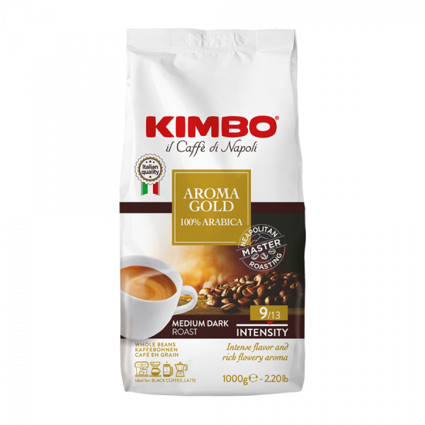 Caffè Kimbo Aroma Gold is a blend of 100% Arabica coffee beans, with a firm body and a beautiful crema. The coffee beans come from Central and South America.
