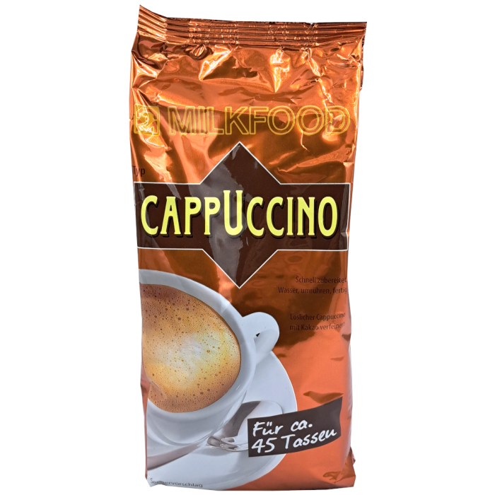Milkfood Cappuccino is a delicious instant coffee made in a snap. Add about 22 grams to a splash of cold water. Stir until a creamy, smooth liquid forms, then pour in hot water. Stir one more time, and your delicious Cappuccino is ready. Serves about 45 cups.