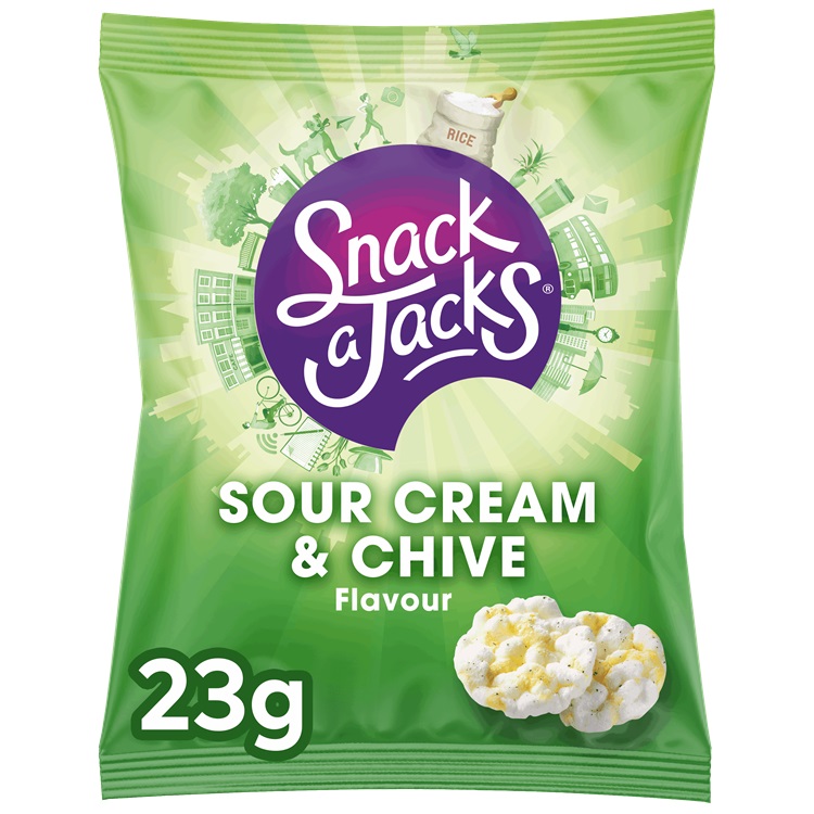 Snack a  Jacks Sour Cream & Chive Flavour sind kleine knusprige Reiswaffeln: lecker, luftig und in handlicher Verpackung. Sie haben einen herzhaften Biss und einen überraschenden Sauerrahm- und Kräutergeschmack.