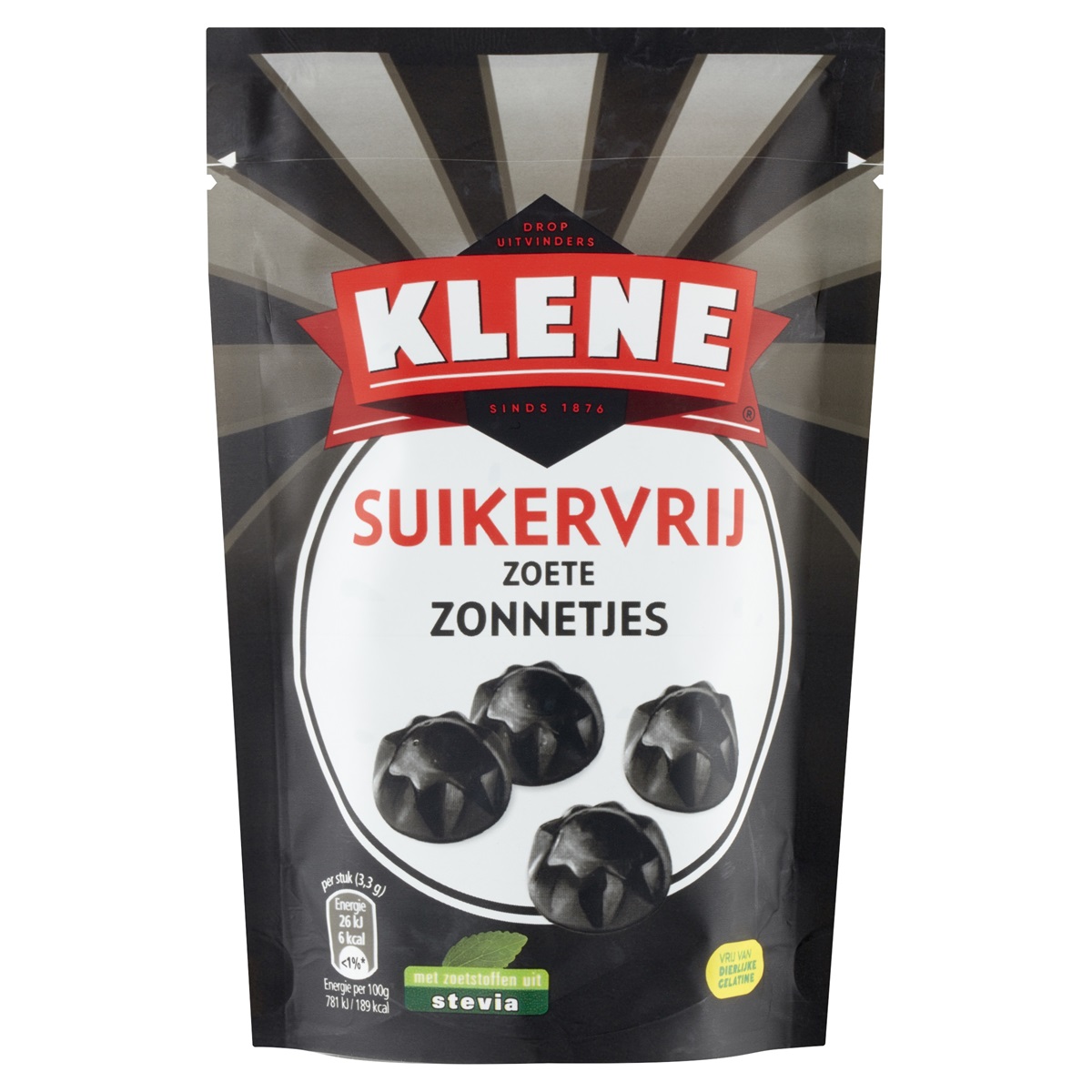 Klene Zoete Zonnetjes (süße Sonnen) ist zuckerfreies Lakritz. Klene, das einzige echte niederländische Lakritz, stellt seit 1876 Lakritz mit Leidenschaft und aus den besten Zutaten her. Wie diese süßen Sonnen. Ein voll süßes Lakritz, zubereitet mit echtem Gummi arabicum.
