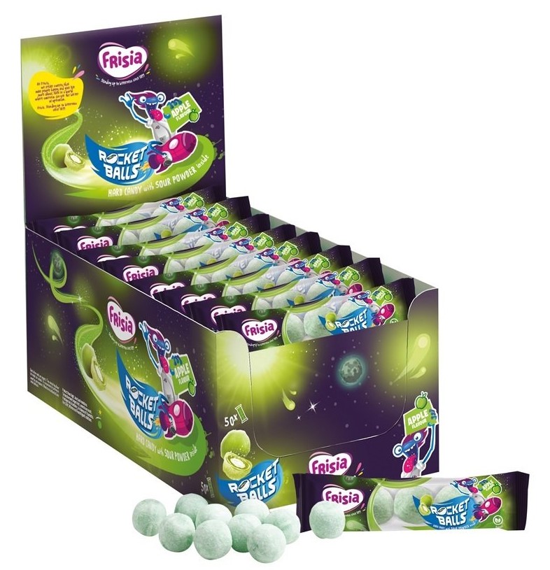 Frisia Rocket Balls Apple are hard candies with a tingling sour explosion on the inside. The green, apple-flavored flavor bombs remain irresistible layer after layer! Let the planets do their thing, take a sweet moment and enjoy these craft candy comets. The Frisia Rocket Balls are vegan and gluten-free. Intergalactic good.