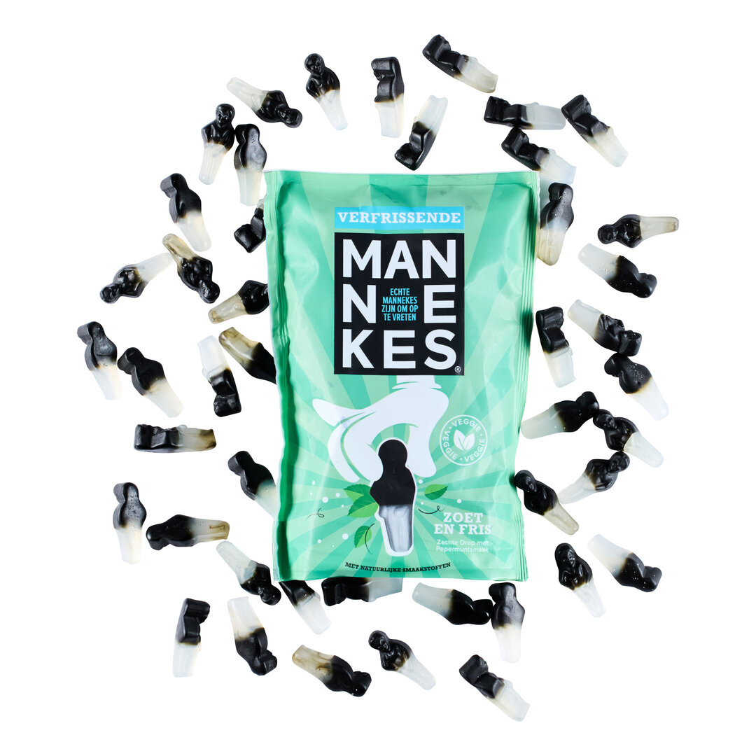 Matthijs Echte Mannekes Verfrissende are seductively sweet & fresh! A soft duo candy with the flavour of liquorice & peppermint. No animal ingredients and (pig) gelatine free so veggie too!