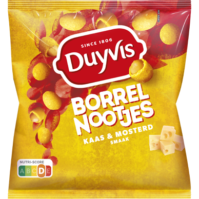 Duyvis Borrelplankje Kaas & Mosterd is an unmistakable classic for the borrelplank. The crunchy coated peanuts have a delicious cheese and mustard flavour, and contain no artificial colours.