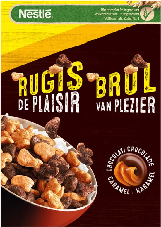 Ingrediënten: Volkorentarwe 41,3%, Tarwemeel, suiker, glucosestroop, zonnebloemolie, chocolade 3.0% (mager cacaopoeder, cacaomassa, suiker), calciumcarbonaat, zout, natuurlijke aroma’s, emulgator: lecithinen, gekarameliseerde suikerstroop, ijzer, vitamine B3, B5, D, B6, B1, B2, B9.
