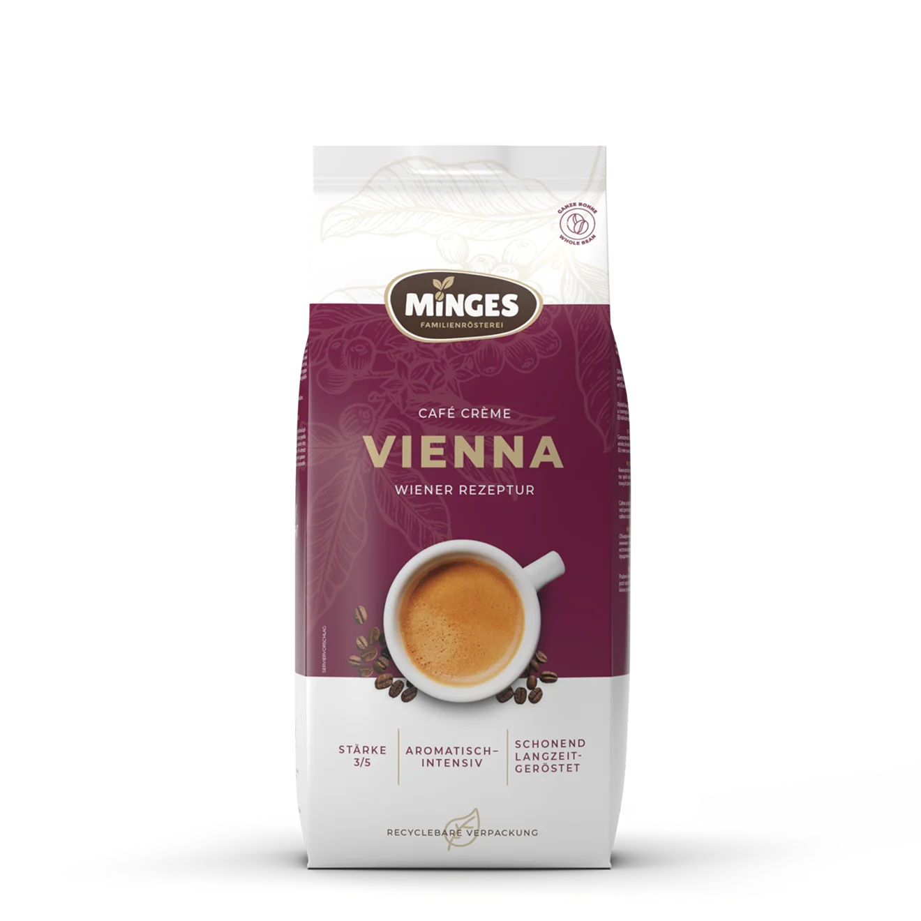 Minges Café Crème Vienna is een typische melange van geselecteerde Robusta en Arabica bonen, aromatisch verfijnd volgens het originele Oostenrijkse recept.