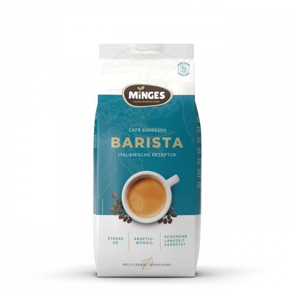 Minges Café Espresso Barista bestaat uit fijne Highland Arabica en een fijne toets van Robusta koffie, gebaseerd op een origineel Italiaans recept, een kruidige, nootachtige body en een kenmerkend aroma.