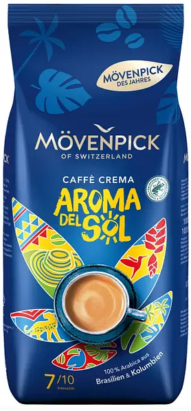 Mövenpick Caffè Crema Aroma Del Sol is een speciale koffie met een vleugje reislust. Met een smaak van chocoladezoetheid, tonen van hazelnoot en een volle smaak, is het de ideale koffie. De koffie bestaat uit hoogwaardige Arabica-bonen uit Colombia en Brazilië. Ontdek de Mövenpick Des Jahres nu bij Five Star Trading Holland!
